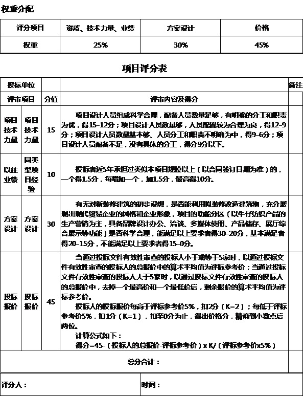 十三、本招标项目以评分权重分配原则进行评标,评分项目含有资质、技术力量、业绩,占比25%;方案设计,占比30%;投标价格,占比45%。以综合得分高者中标。项目评分表详见附件。