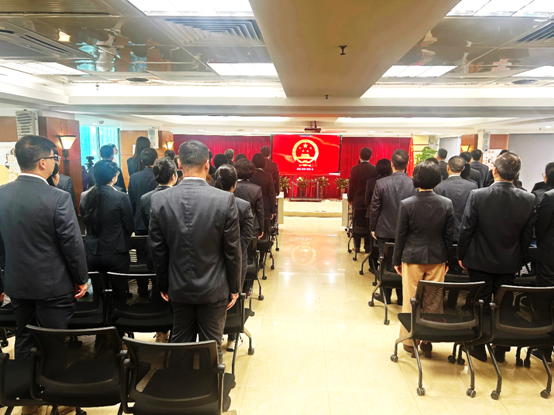 上午9点,公司在广德大厦15楼礼堂举行了升国旗仪式,属下企业以视频方式参与到升旗仪式中。公司副总经理林哲浩代表领导班子在仪式上致辞。他指出,2024年,是中华人民共和国成立75周年,是实现“十四五”规划目标任务的关键一年,希望大家以龙腾虎跃、鱼跃龙门的干劲闯劲,开拓创新、拼搏进取,以优异的成绩为祖国的发展作出更大贡献。
