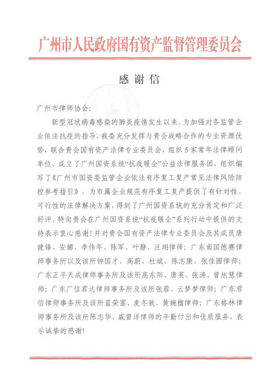 服务:充分发挥专业优势,助力复工复产。开云(中国)Kaiyun·官方网站汪翊律师作为广州市律师协会国有资产法律专业委员会的成员之一,积极投身广州国资系统“抗疫暖企”公益法律服务团,参与编写了《广州市国资委监管企业依法有序复工复产常见法律风险防控参考指引》, 并得到广州市国资委的诚挚感谢。